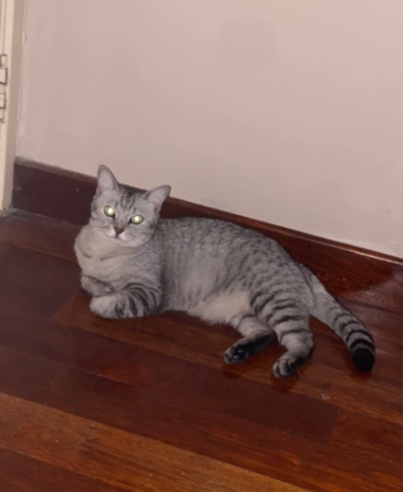 Shy grey tabby, shorter tail with a nub. No collar but microchipped. Around 4 kgs, black paws.