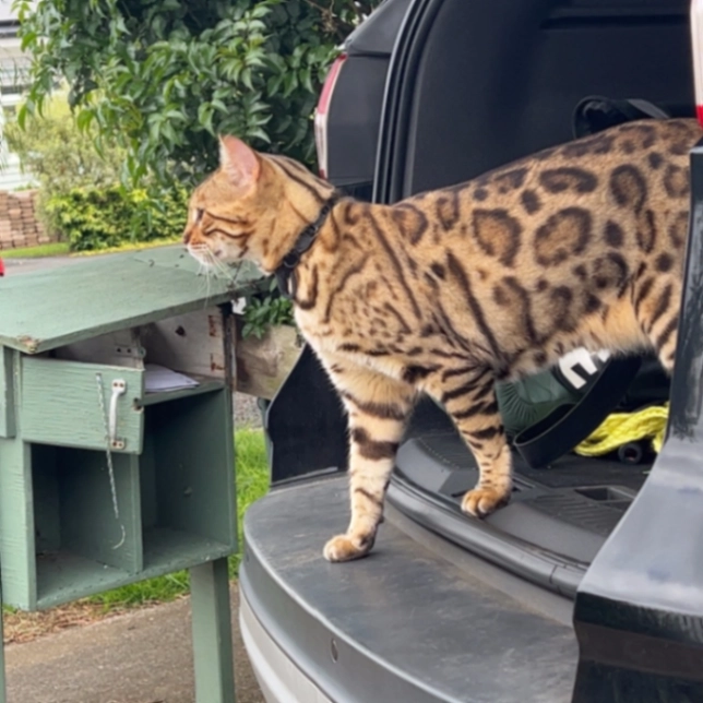 Heis a 5year old desexed bengal, very friendly and he responds to the name “Beeo” or Clark sound made by mouth.