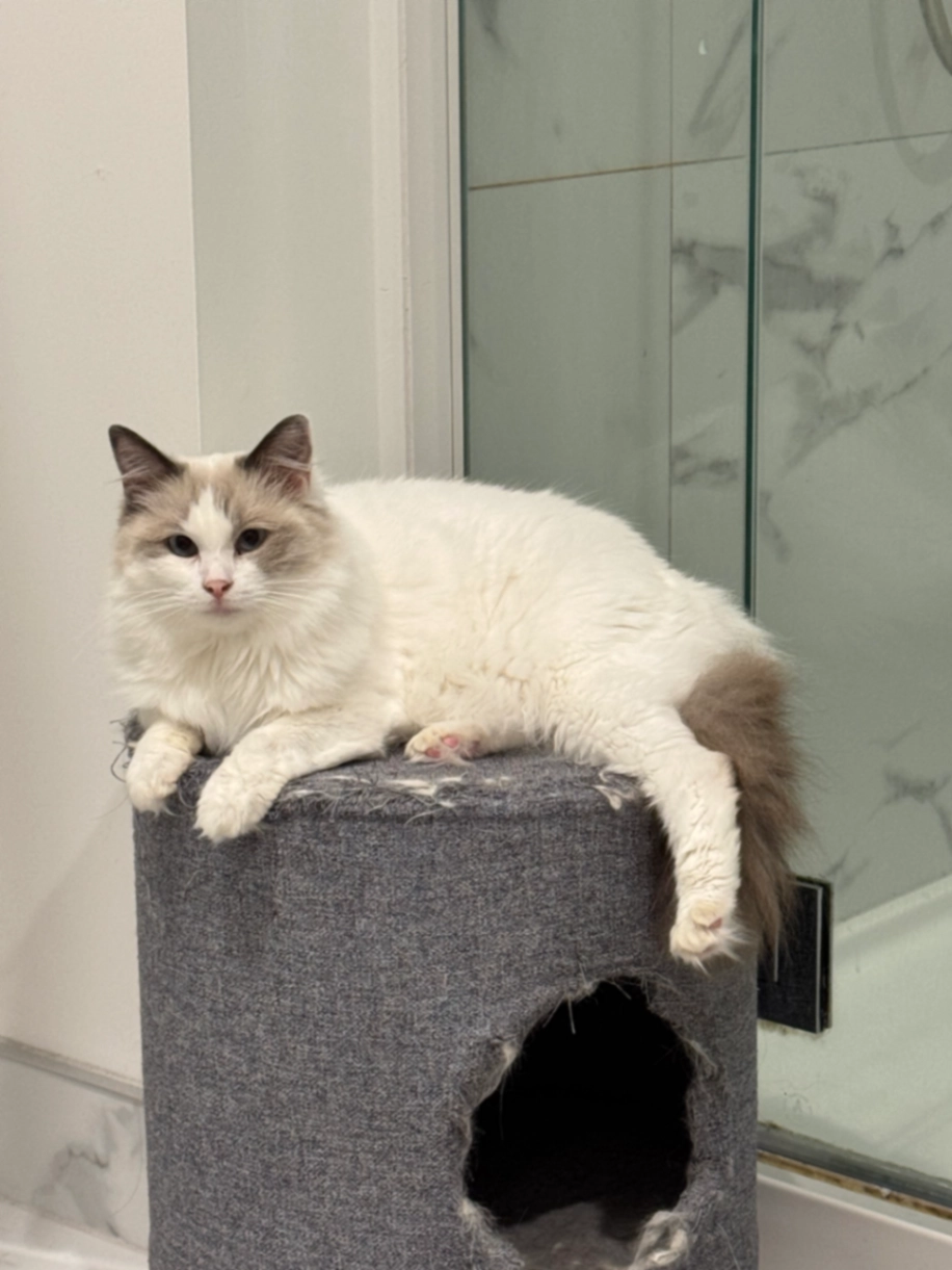 Toona is an extra long cat. He is quite timid around unknown people. He is very much loved and needed back home. He loves breakfast time and loves go for a walk around the yard with me.
