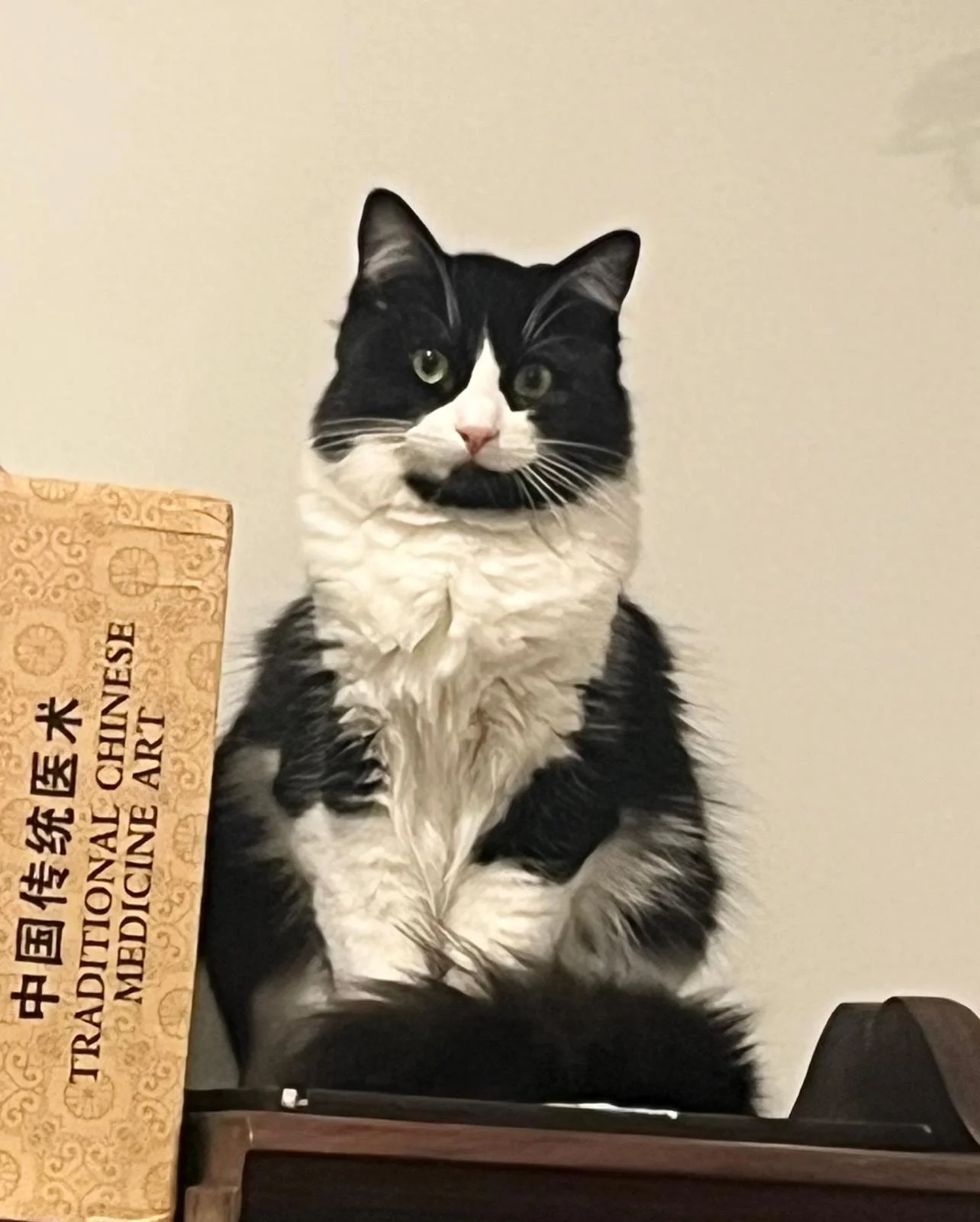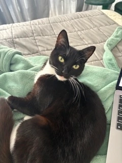 Black and white cat with short to medium fur and a very distinctive face pattern.