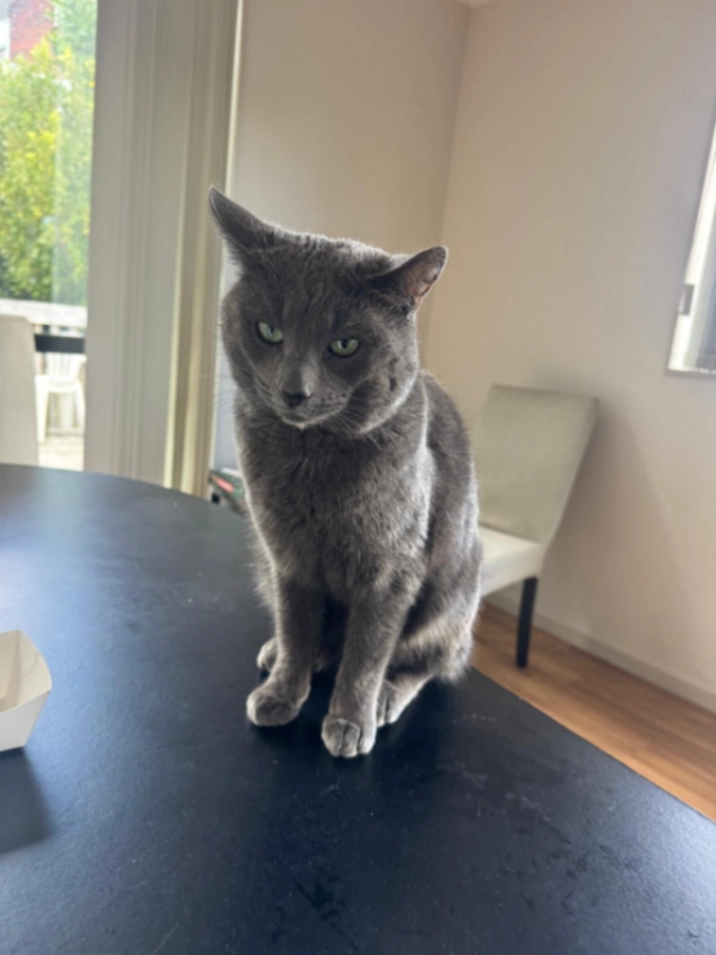 Blaze is a solid gray short-haired cat (likely Russian Blue type) with bright green eyes. He is NOT microchipped and does NOT wear a collar. He is 5 years old, friendly but may be scared and hide in quiet spots like under decks, in garages, or bushes if lost.
