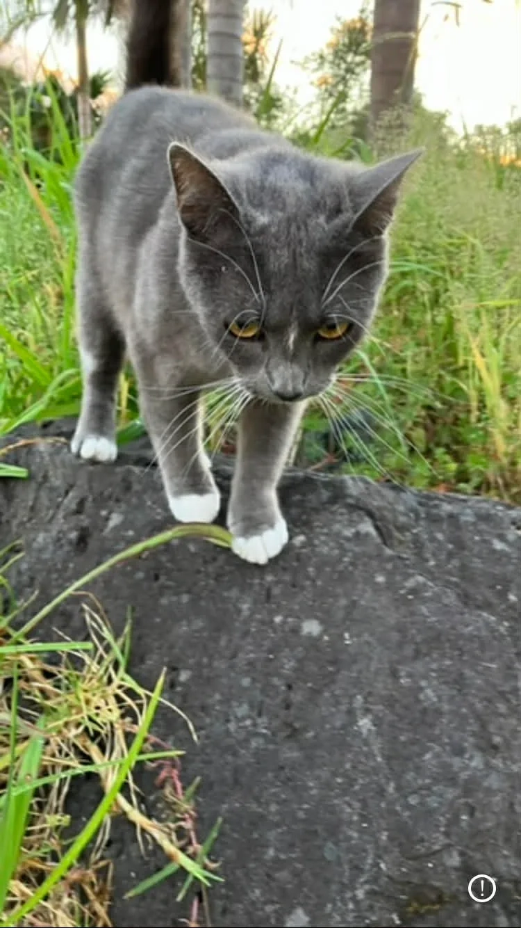 1 year old slender female cat with white socks and chest and a tiny stripe of white on her face. She will respond to her name too.