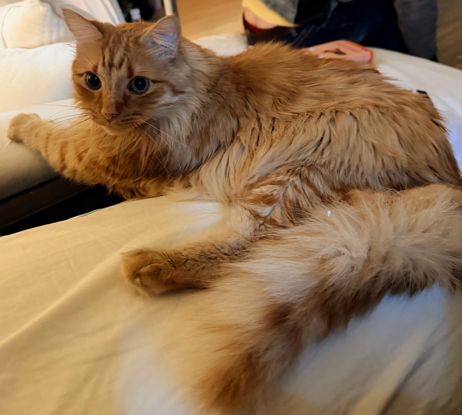 Freddie is just over a year old with a ginger and white short haired coat and a long striped tail.