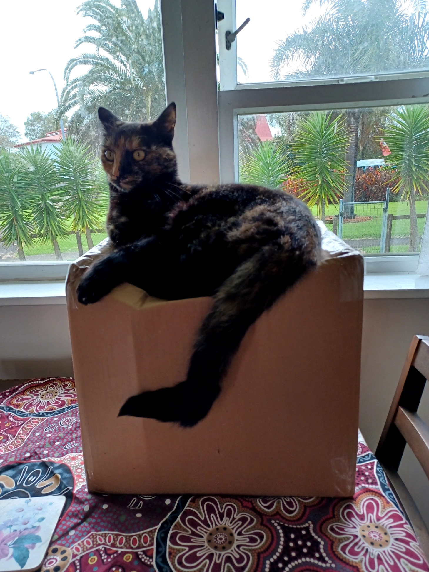 She normally stays close to home, so she is likely still nearby, possibly hiding in garages, sheds, under decks, or in bushes.