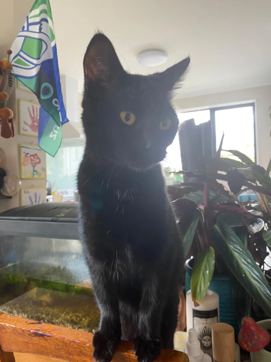 Lola is a very small cat, 1 year old. Fully black with just a few white hairs on her chest and near her feet. Microchipped.