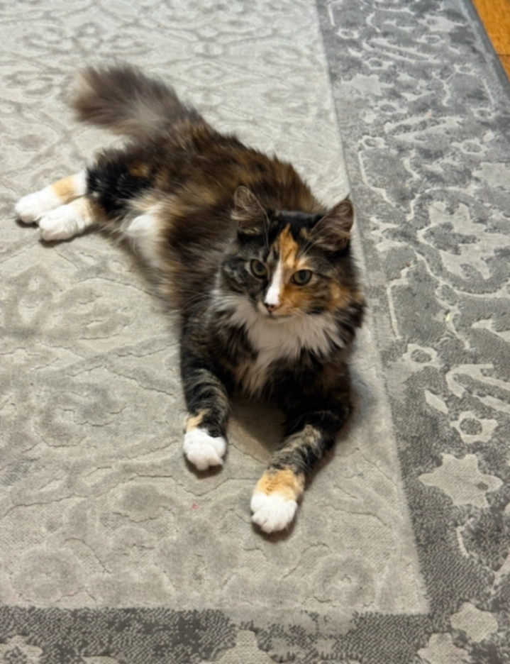 Tortoiseshell, long thick fur. Her face is black and the other half is a light creamy brown. Small face, long body and a white patch on her neck/torso area. Very fluffy tail, hard to miss.