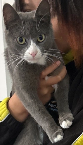 She is a small Grey cat with White markings on her face neck and chest paws , Big green eyes and is very approachable and kind nature