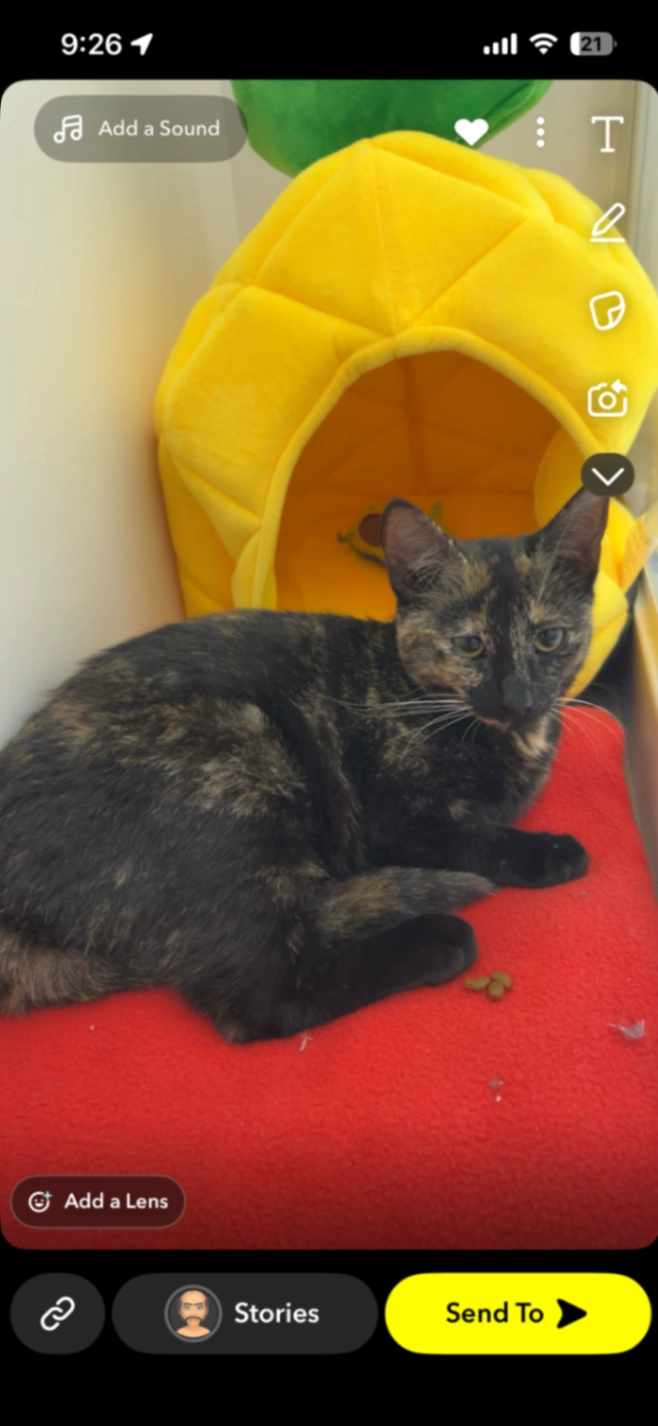 He’s a very loving and curious cat. He’s only been adopted 5 days ago. He managed to broke the pet door that I taped. He’s a smart cat and he might go to your house.
