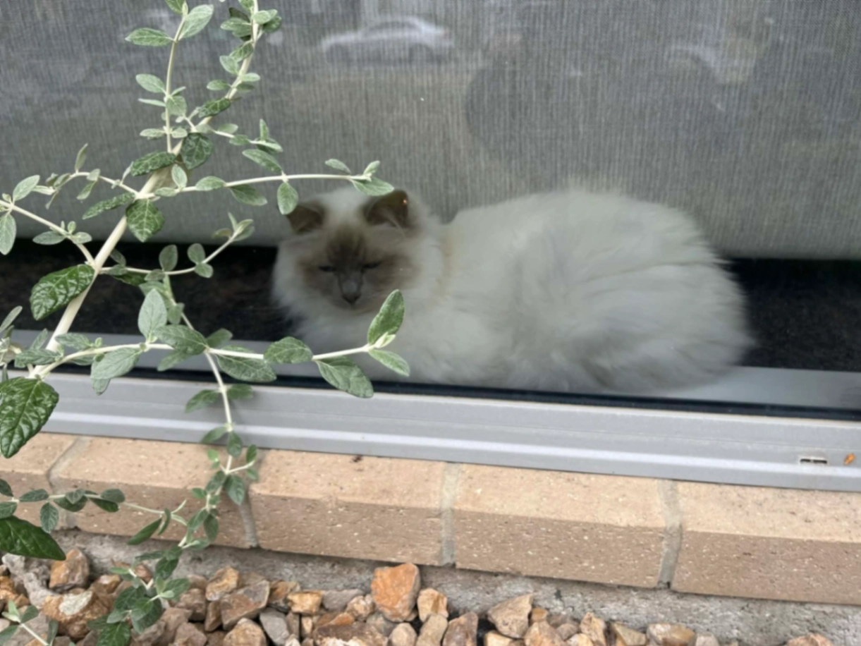White Liliac point Birman, blue eyes. Three years old, four kilos. Incredibly soft and cuddly. Loves people and usually lives indoors.