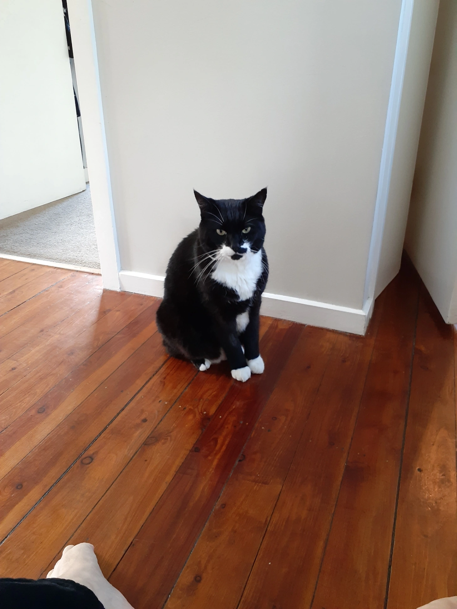Black and white tuxedo cat with a stubby, deformed tail, about half the size as a normal tail