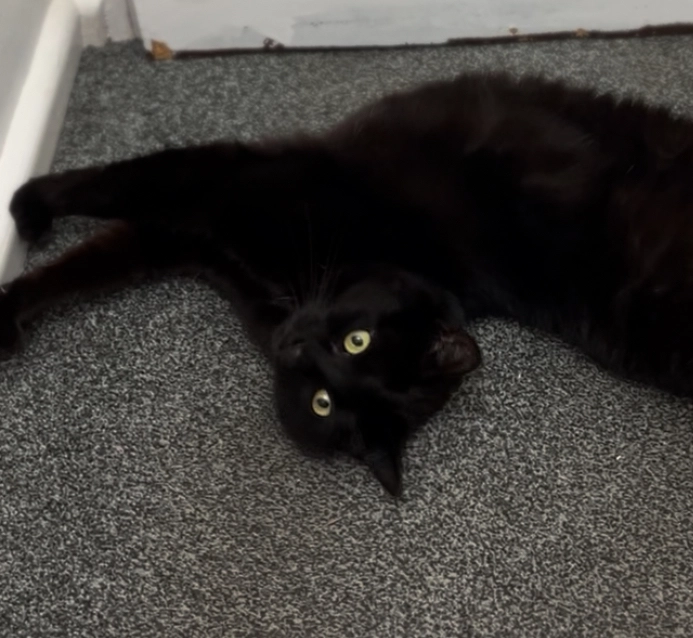 Robbie is 9 1/2 months old. He’s not small but he isn’t fully grown either. He’s quite shy and a bit flighty. He’s completely black.