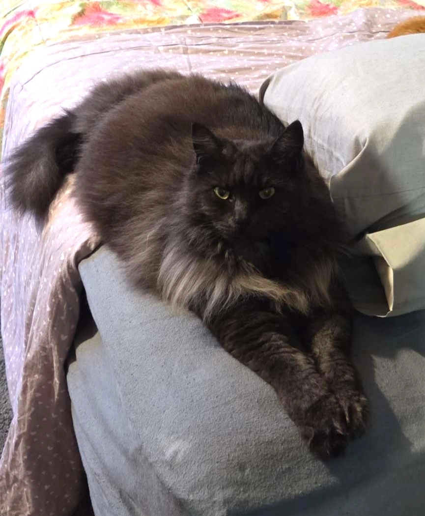 Big black and fluffy. Really dense coat with silver/white underneath the black coat
