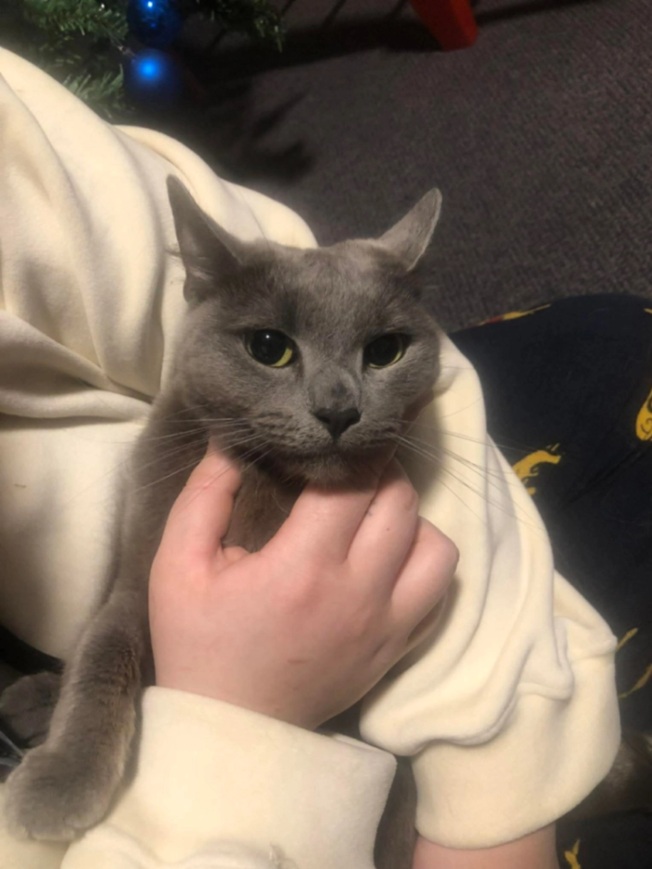 Long haired tabby with a blue collar, green eyes. Quite shy and skittish