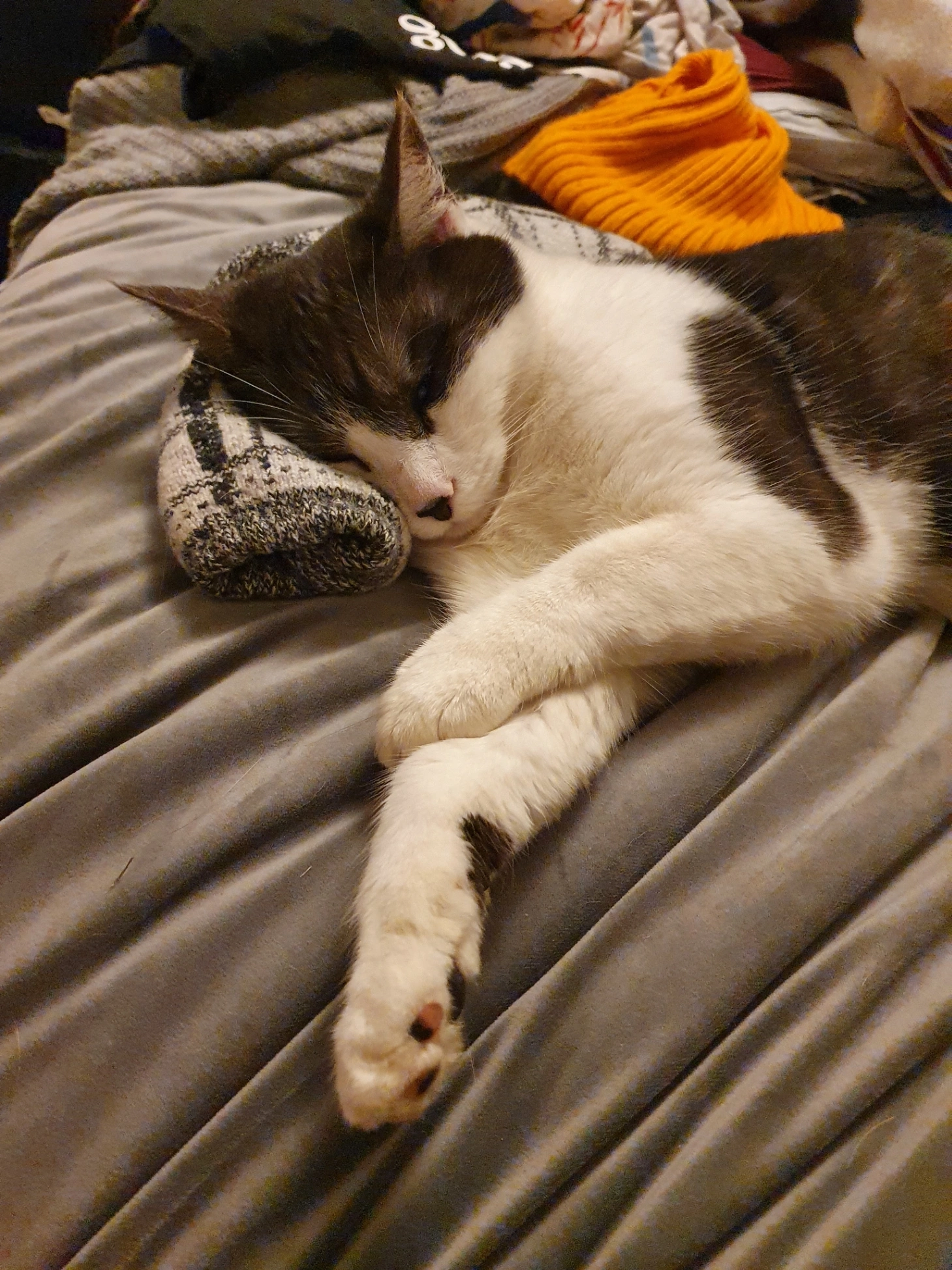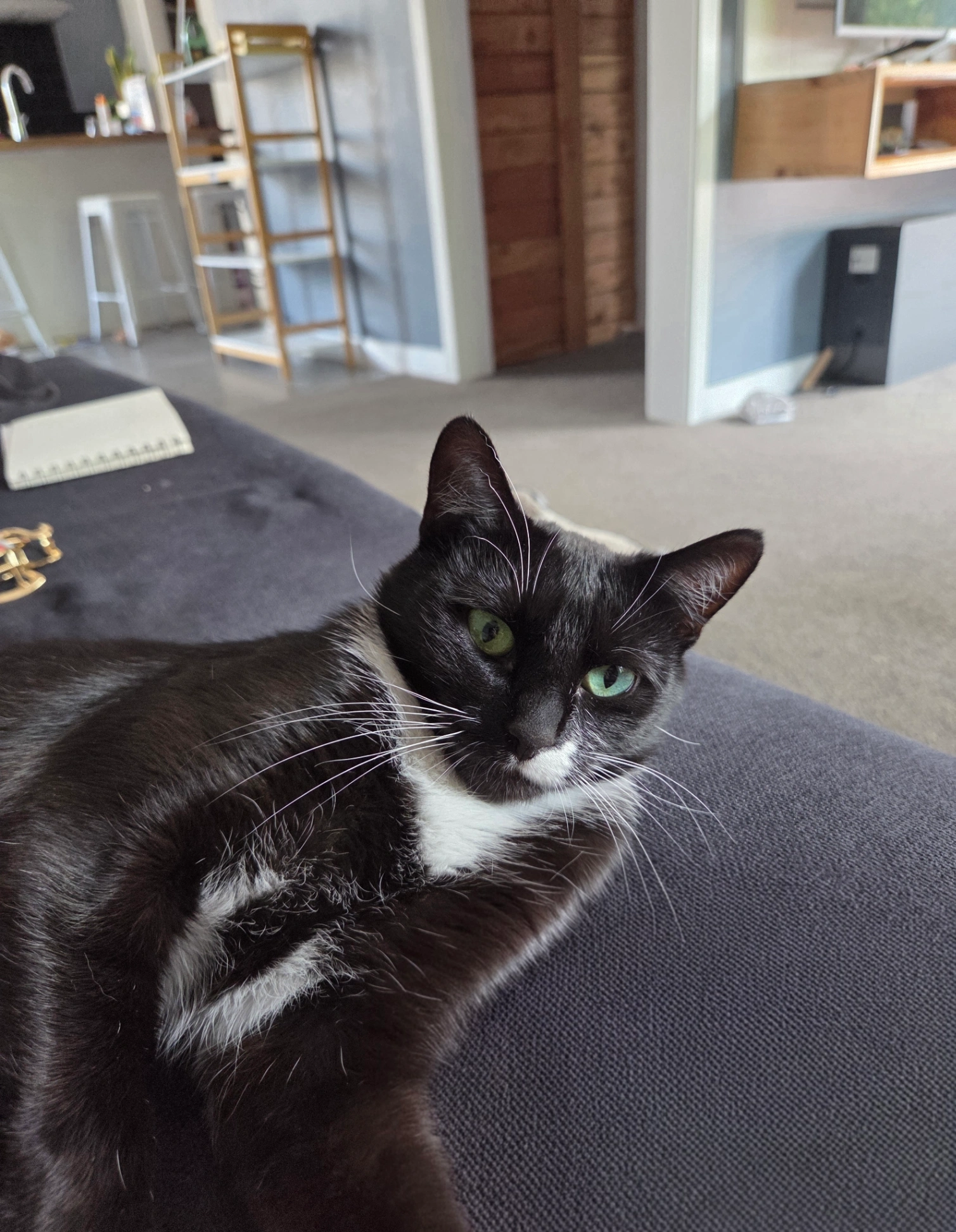 Freya is a small black cat. The tip of her left ear is slightly bent back due to an old injury. She is chatty (meows loudly), friendly, and likes to roam.