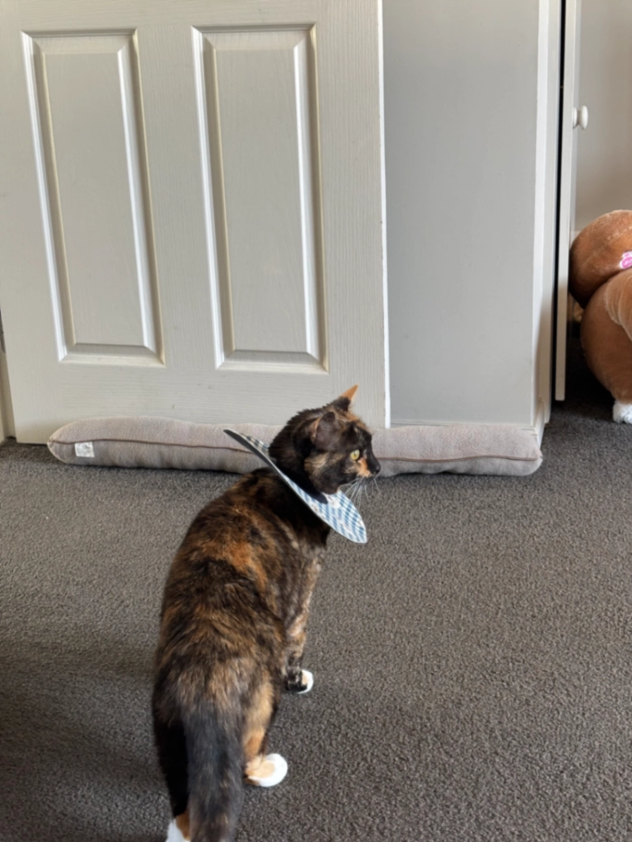 She is Tortoiseshell, blue and white soft cone, small, easily frightened, 6 years old, shaved patch on her head