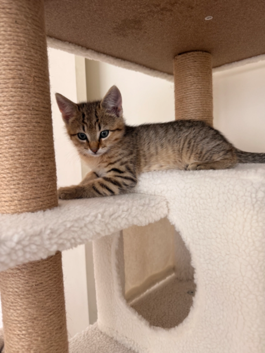 Short hair tabby with a long luscious hook tail. Bright yellow/golden eyes.