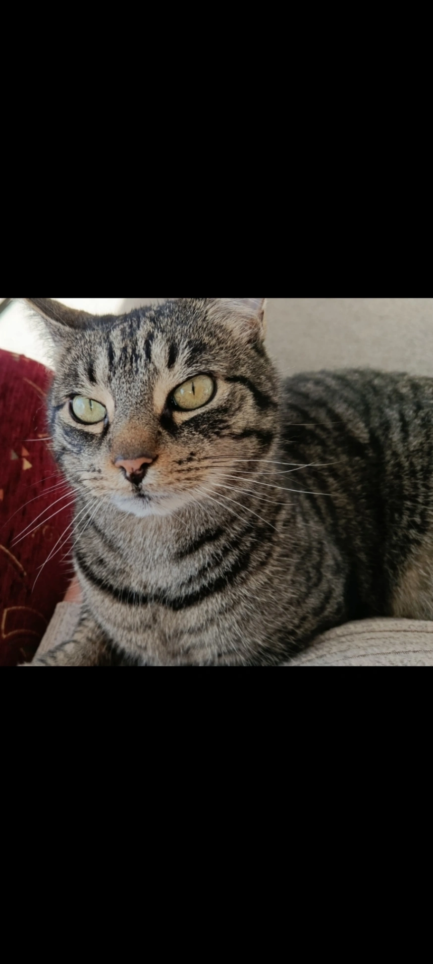 Maxi is a fixed tabby boy. He is also microchipped. He has a little black mark on his nose from a injury he had few years ago. He also.comes to maxi, Maxwell and smelly Welly.