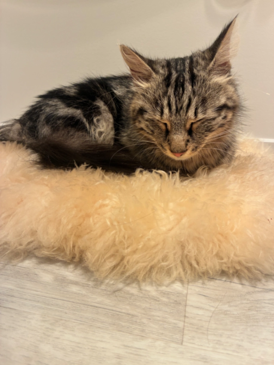 Tabby small girl, long hair like a maincoon in her ears, black fluffy tail, thick black tabby stripes on her back