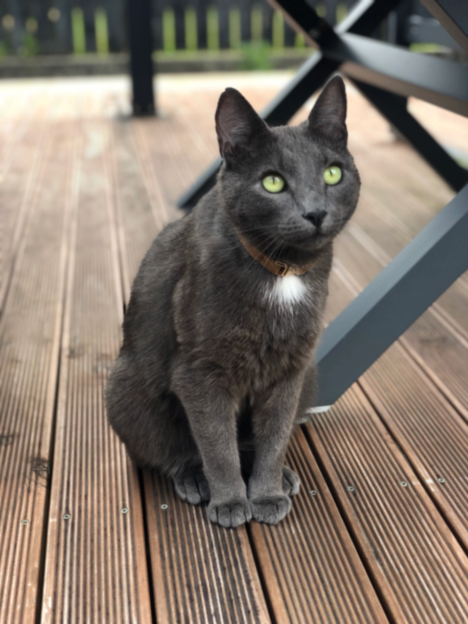 George is shy, and quite little. He is wearing a blue collar