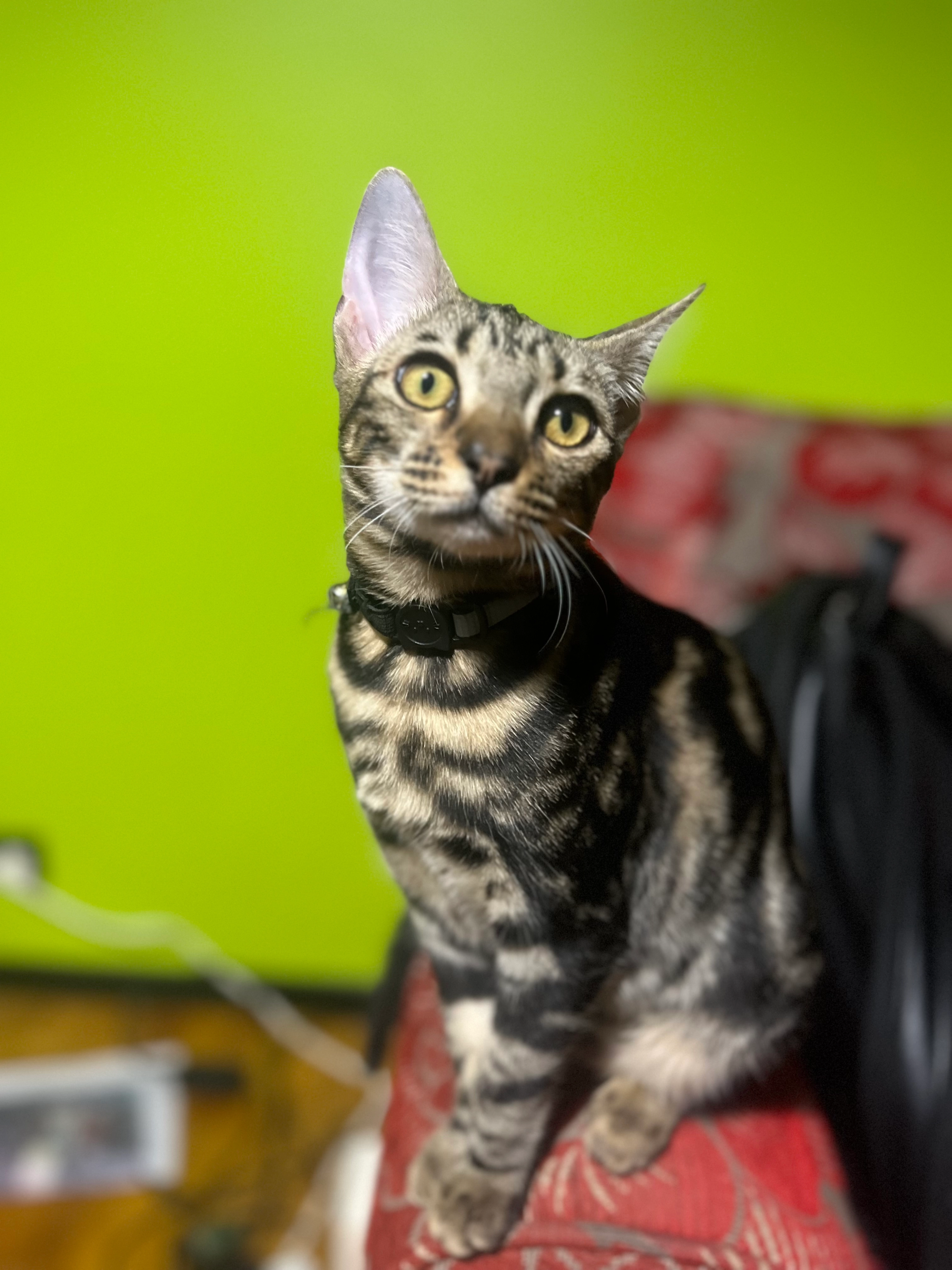 9 month old kitten. Wearing a pink collar with bell. Not been outside much so may have got lost or frightened. Or could have been locked in someone’s garage