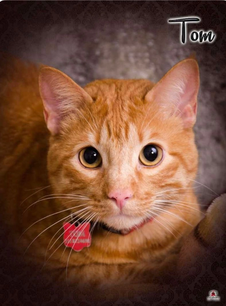 Gato laranja, tem um colar vermelho com o contacto do proprietário.