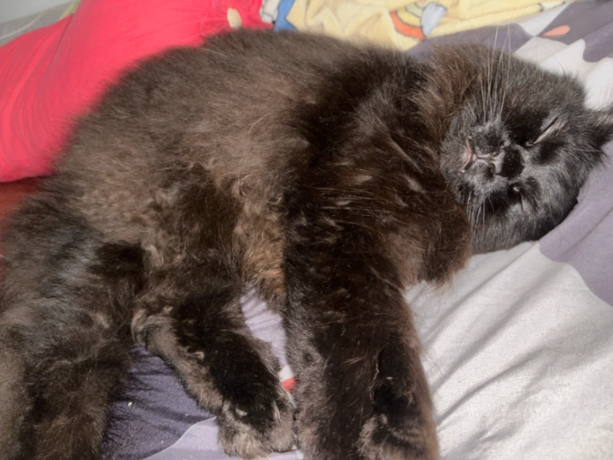 Black/greyish fur, tipped ear on the left side. He loves chicken and is abit timid