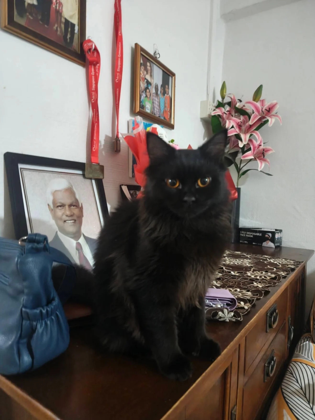 Black fluffy make cat with orange eyes and friendly personality