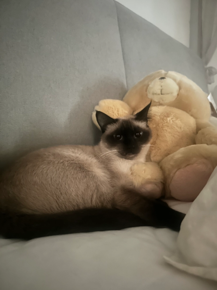Siamese lean body small sized, no collar with a bucked tooth