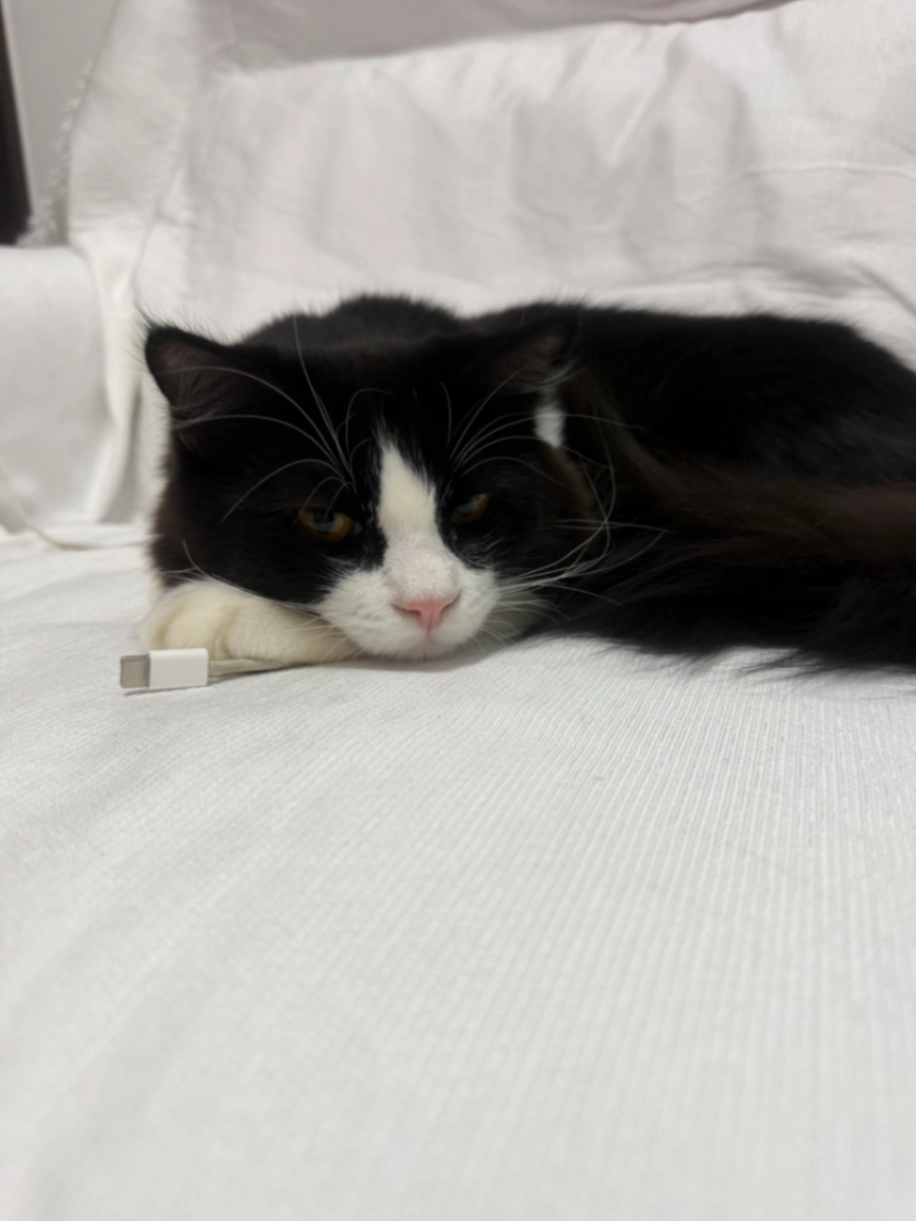 Tuxedo cat, shy around people, doesnt meow much, male, 7 months old, quite a big sized cat, skinny