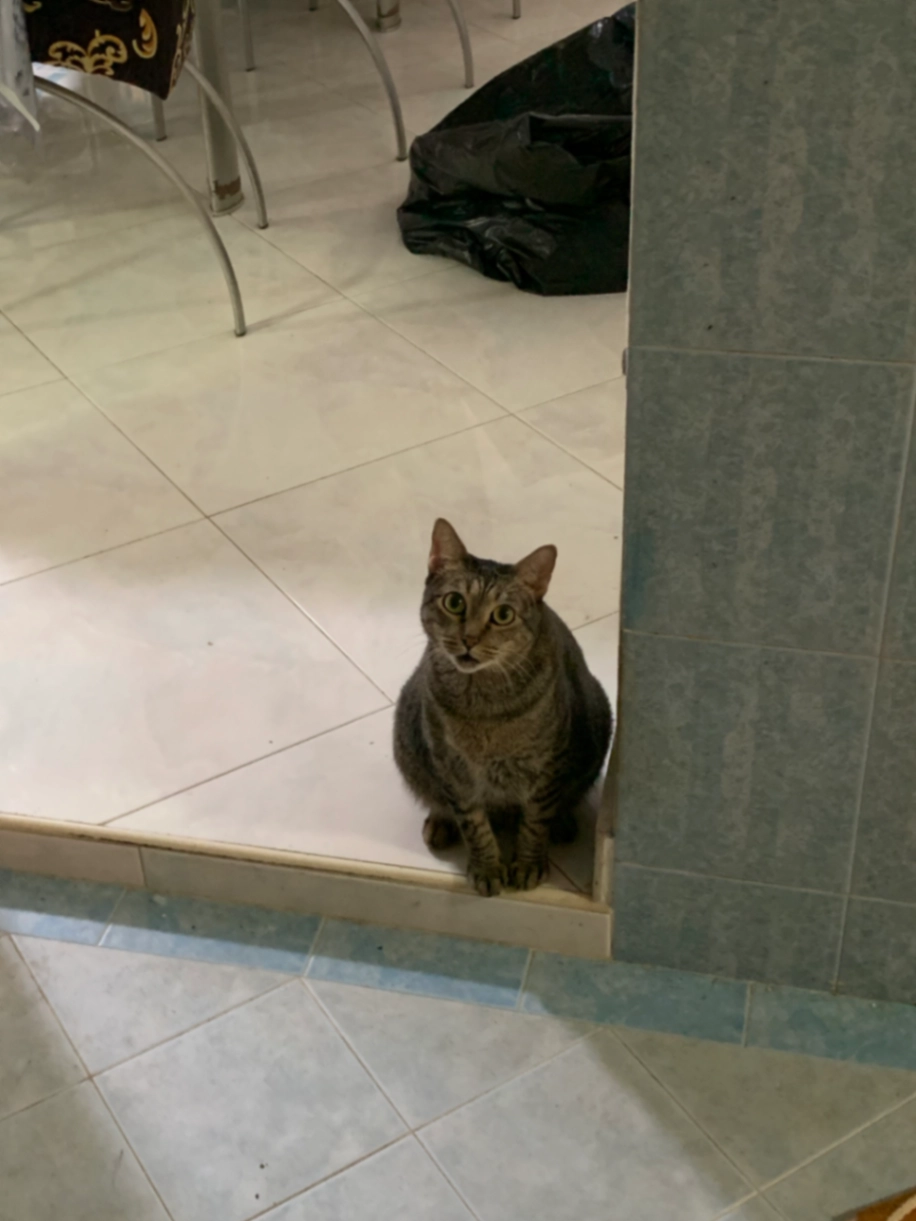 Chubby tabby cat with long tail, last seen wearing a blue harness. Scared of people and may respond to her name.