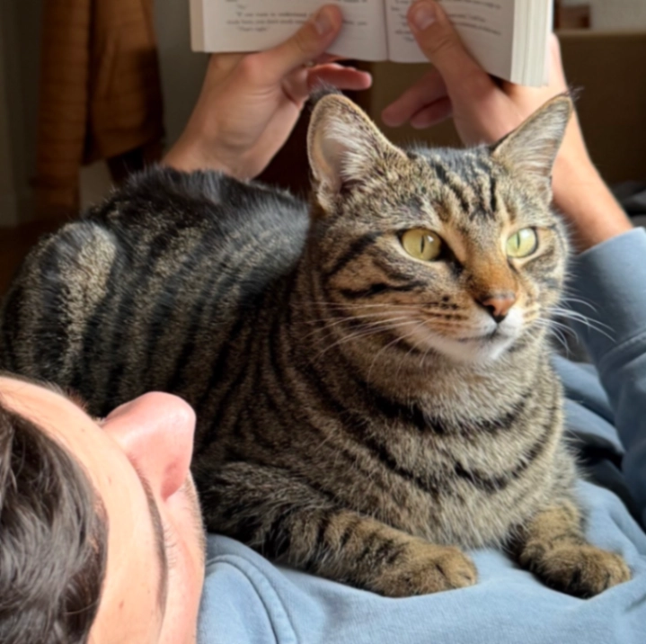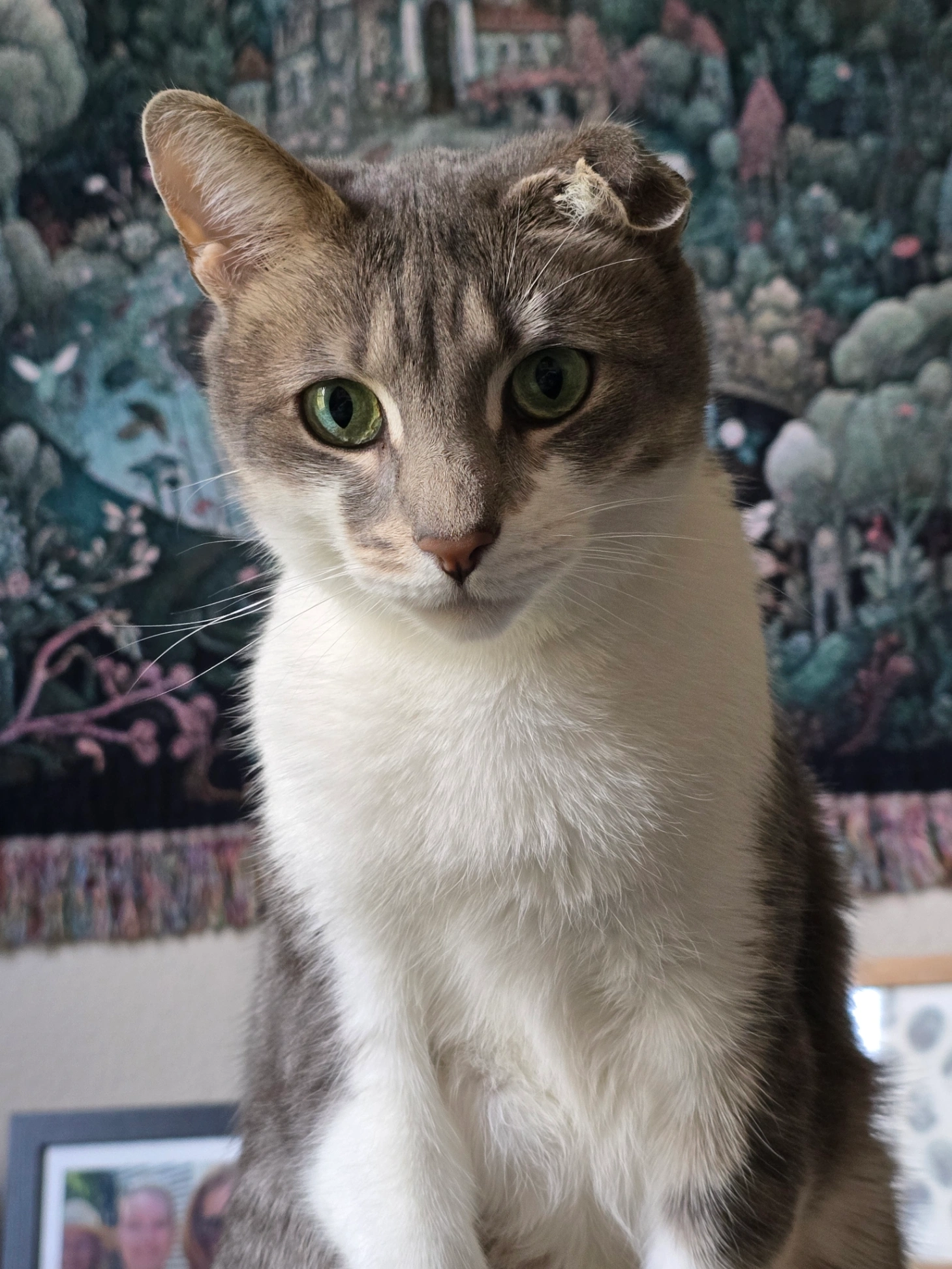 Friendly senior cat, loves the sound of a can opening or treat bag shake. Hes skinny and very light for his size. Hes okay with being picked up