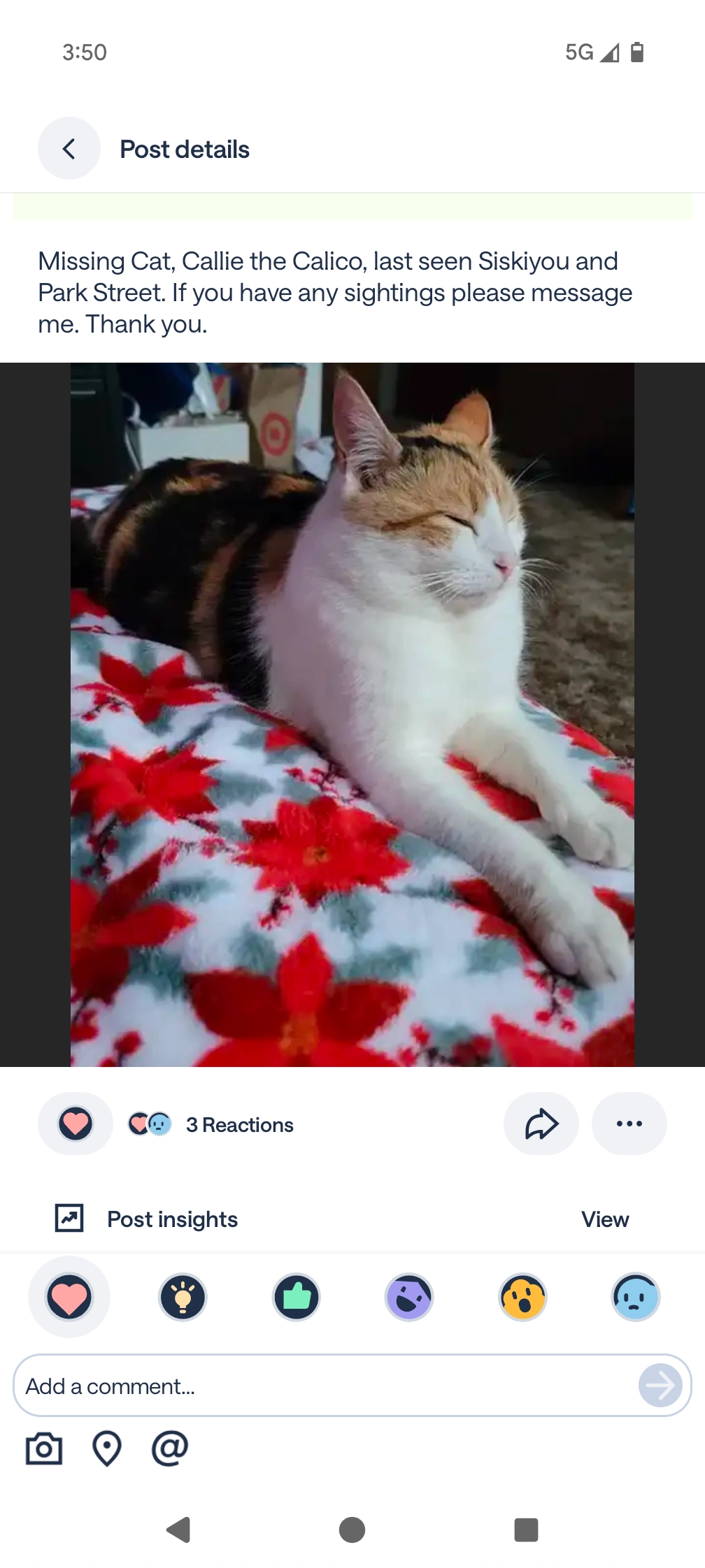 PercyReunited after3d, 8hWe have been so grateful for the overwhelming support from neighbors and so many other people we’ve never met. They sent information on how to entice him home, and we did EVERYTHING suggested. He’s home now and he’s the happiest cat to be home. Particularly valuable was the suggestion to set up a “home away from home” area as close as possible to the house and the door he left by (we used our kitchen porch) with food, water, and his familiar belongings, like his favorite bed and some of our dirty laundry for the scents. Looking for him at night with strong smelling food was the final piece of the puzzle. I put out deli chicken and he came when it got dark. I pushed the kitchen sliding door open. He RAN inside when he realized the door was open, and hasn’t been out since. Thank you everyone!! What a wonderful community you all are!!!!!