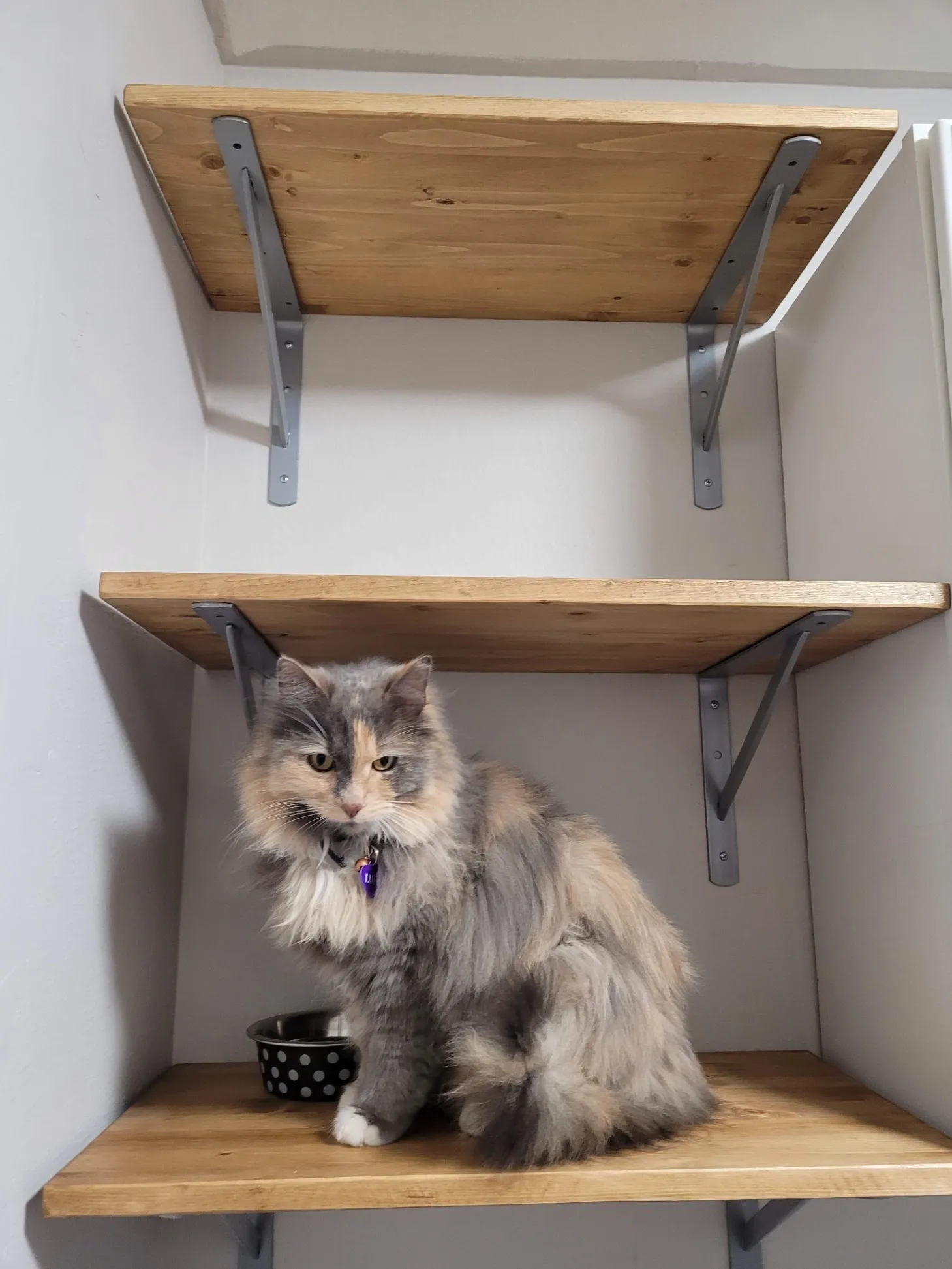 Wearing an orange tito's collar with her name and our phone numbers on a name tag. She is microchipped. She is indoor/outdoor, very friendly but skittish of new people. Orange, white, grey, tan colored with calico face markings, long haired domestic, looks like a ragdoll mix.