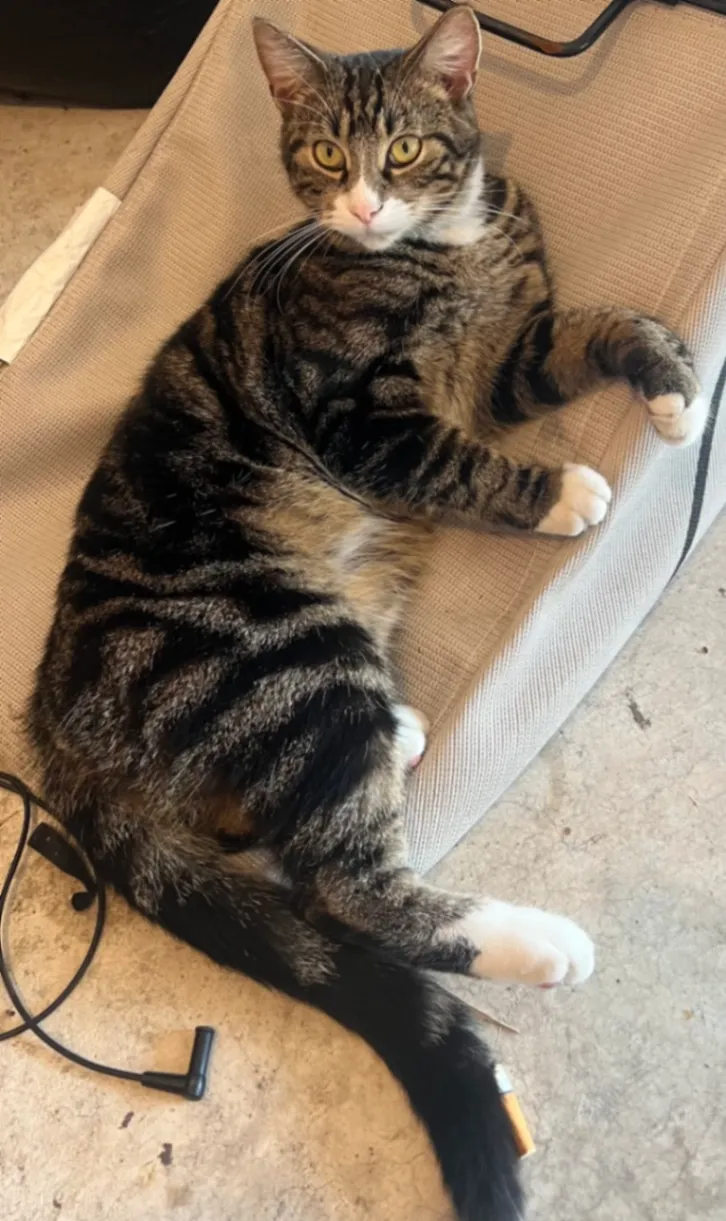 Ozzie is a friendly male tabby with a white chest and white front paws. He has yellow-gold eyes, a pink nose, and short brown fur with dark black stripes. He’s very social, neutered, and microchipped (waiting on chip number).