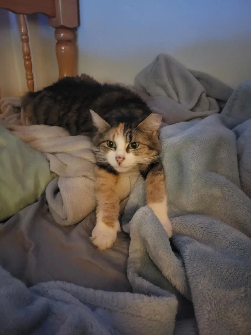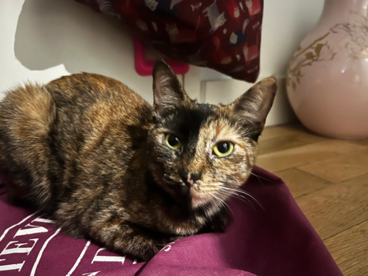 Very sweet spunky tortie, she escaped our backyard and is now driving us crazy.