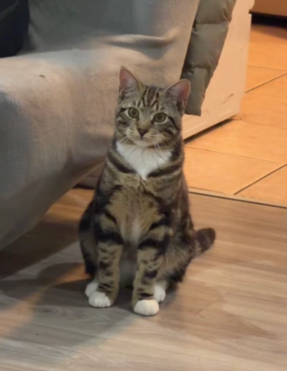 Gato marron con rayas negras las 4 patas blancas y una mancha blanca en el pecho