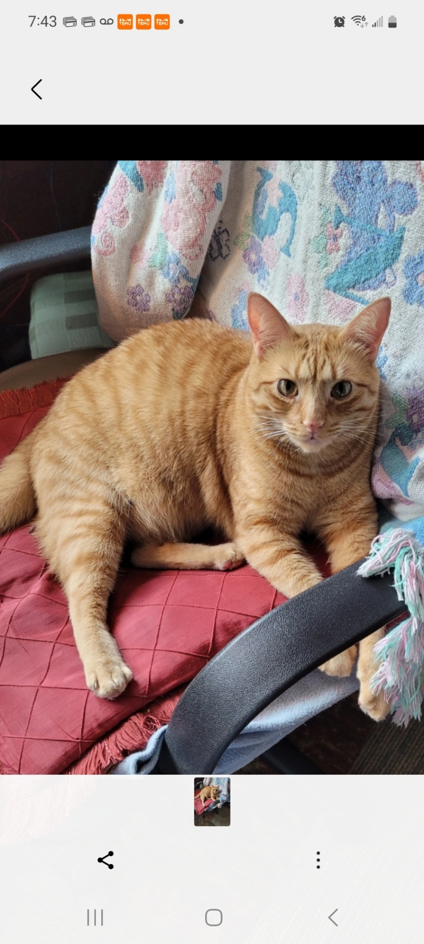 Orange, 10 month old boy, neutered cat: no collar. Microchipped.