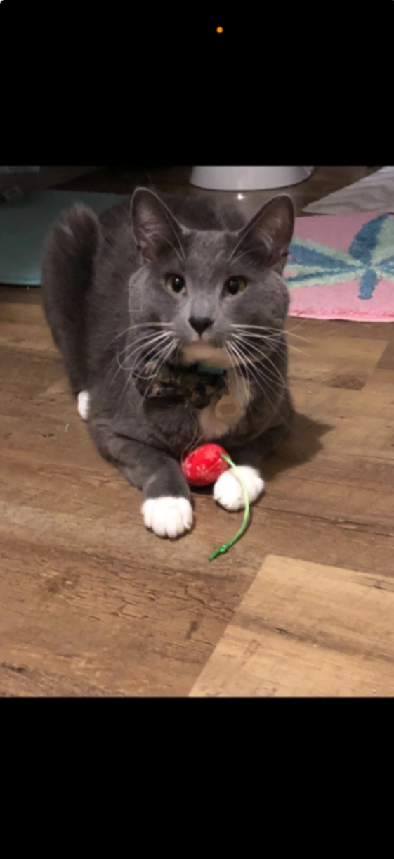Doughboy belongs to my Niece and brother. He is grey short hair with white paws and white chin & neck area. He should have a color with his name unless he got caught on something.