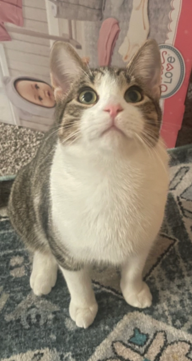 He’s grey and white with some brown. He has one black toe bean in his right back paw. He’s not neutered or chipped. He has a grey testicle and a white one. He loves wet food and cat snack . He’s skittish with unknown people and will try to run. He’s not feral at all but he does frighten easily. He’s always been an indoor cat. He’s very chunky at just 10 month old