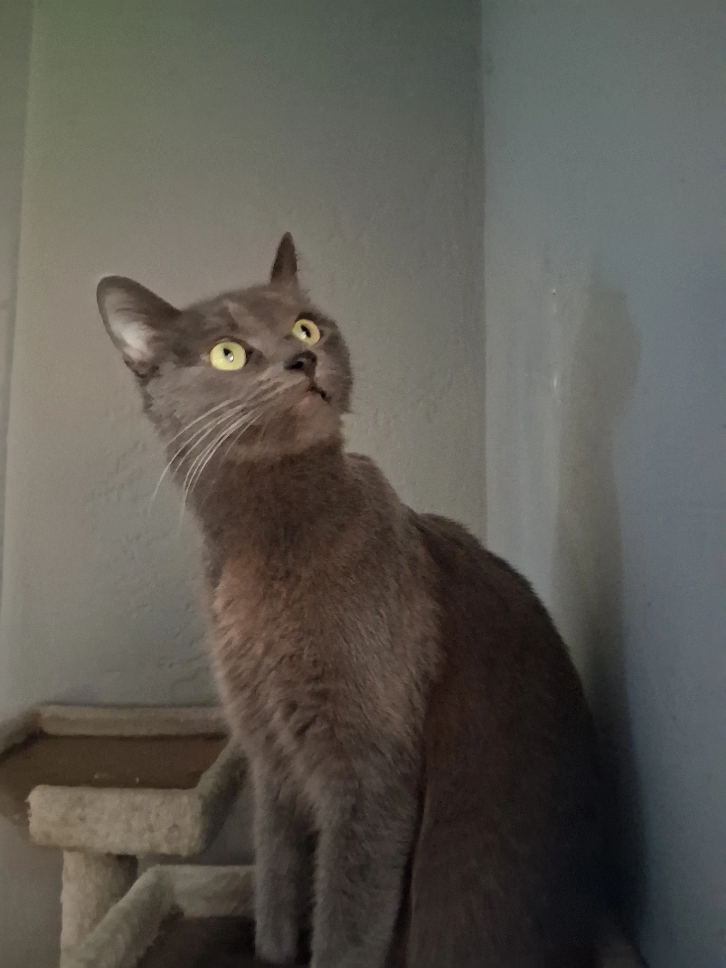 Dolly is a female fluffy gray cat. She is about 5-7 lbs and not spayed. She had markings on her face that are colored light and dark gray, and white. She has light gray and white tips on her tummy.