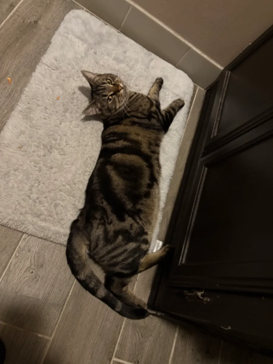 He’s a chubby cat with beautiful stripes and black under feet