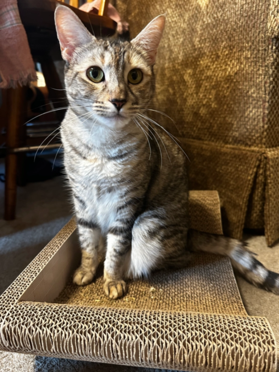 Spayed female. 4 years old. grey and black stripes, yellow eyes, white belly. Small/medium sized about 10 pounds.