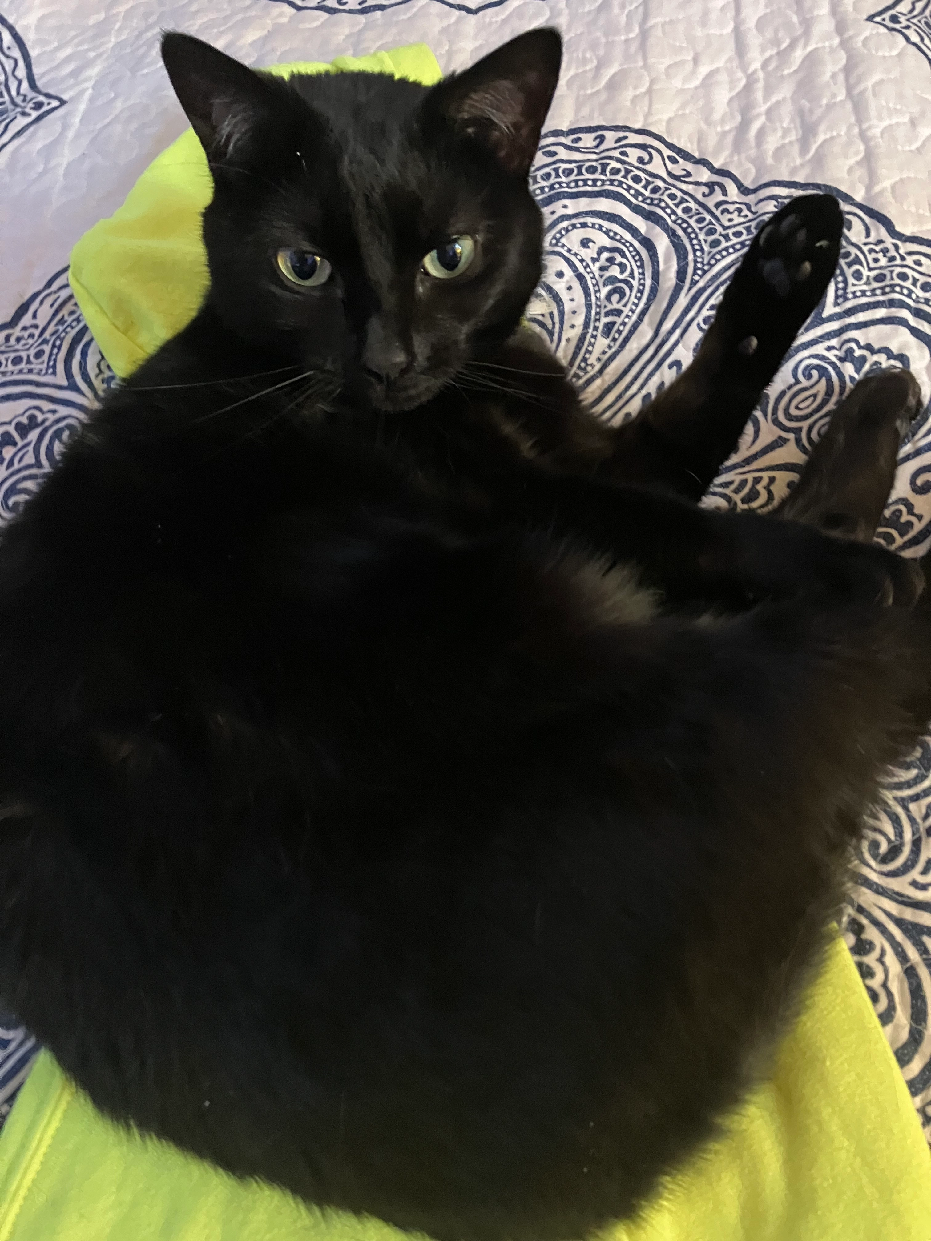 He is all black with a neon green collar