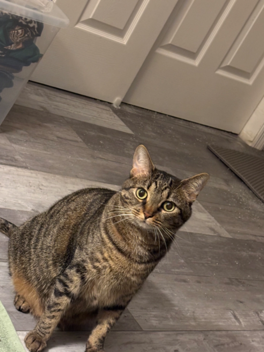 She is grey tabby, light grey, with tip of her tail orange. She is friendly, but scared.