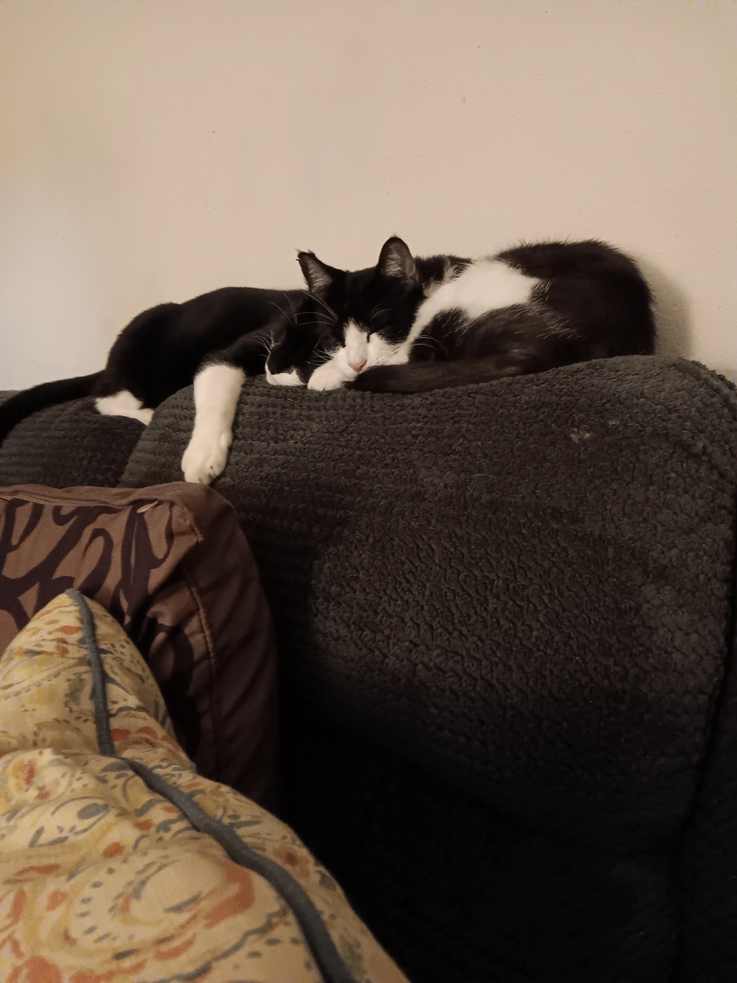 Black and white female cat. One ear is curled back, the other is clipped. She has tan spot on her front leg. Please help our baby come home!