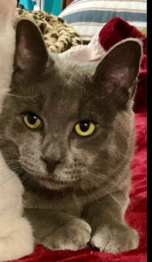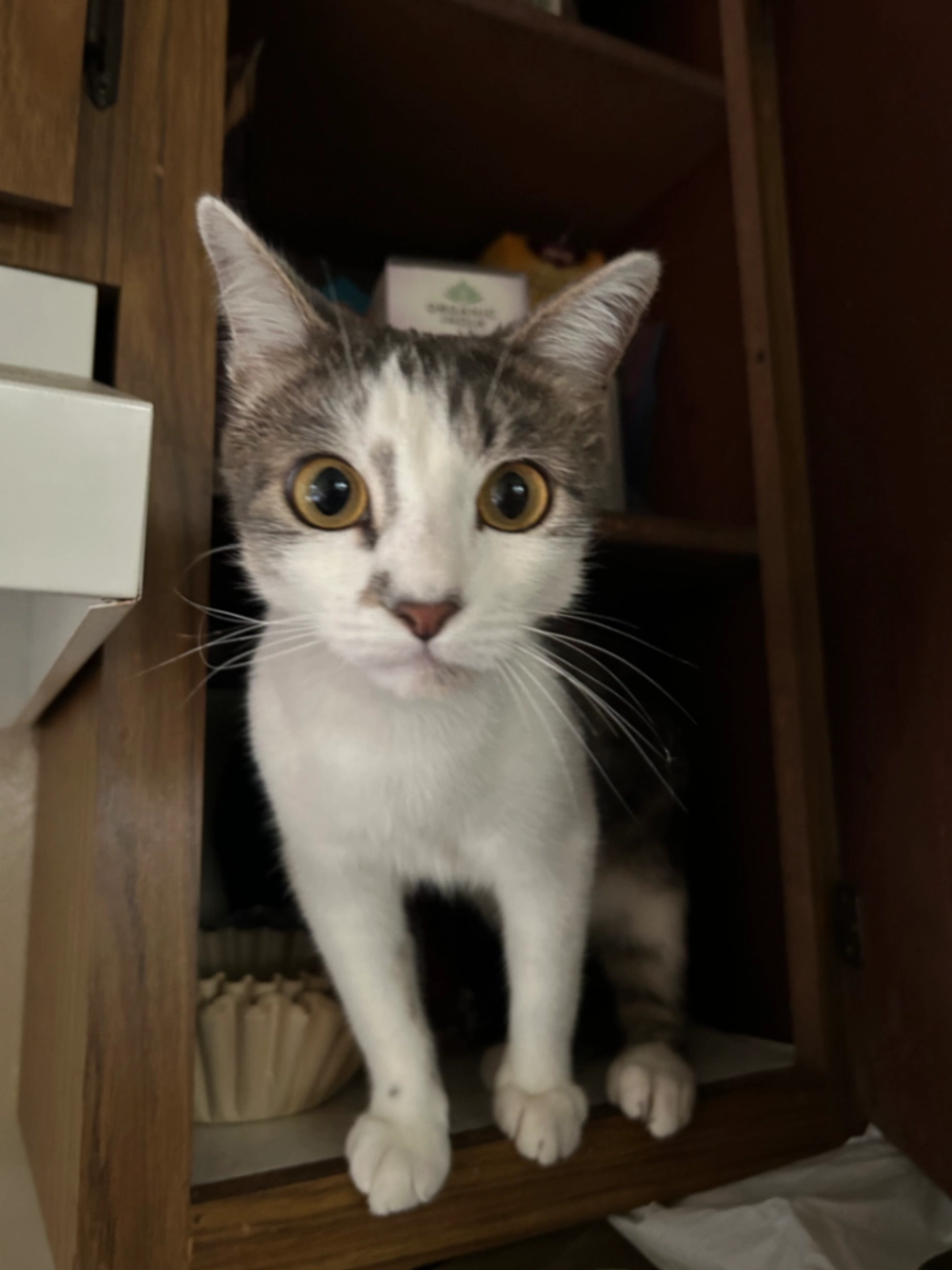 Medium sized boy, sweet but shy, white with grey fur and green-yellow eyes.