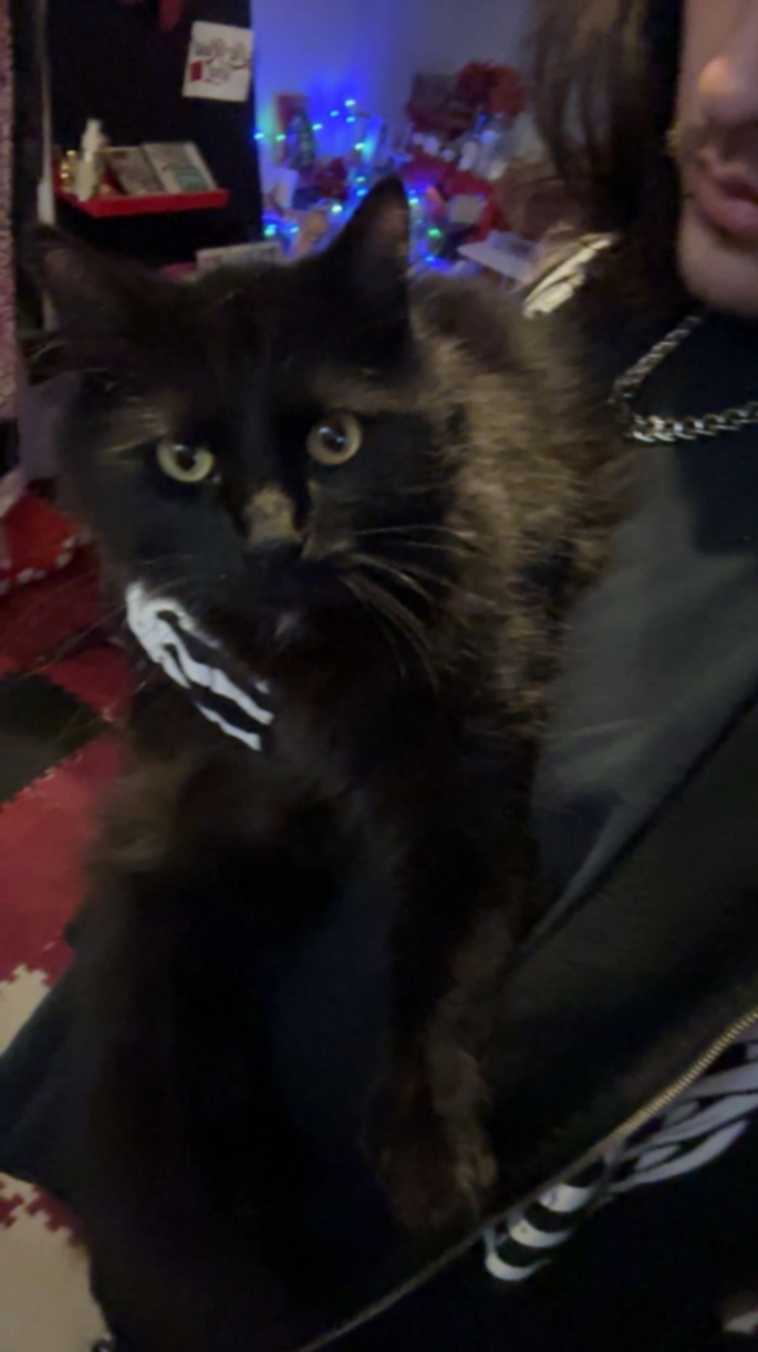 Long hair black cat yellow eyes,tiny little white spot under front neck, 6 toes on each paw