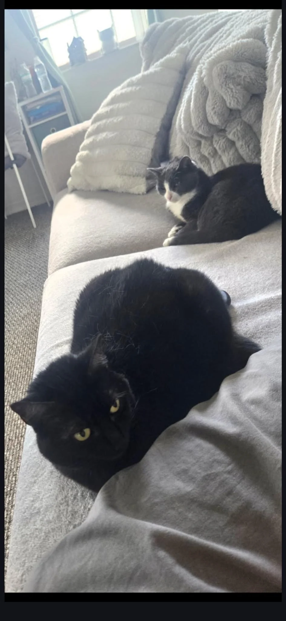 Black fur, green eyes, very friendly