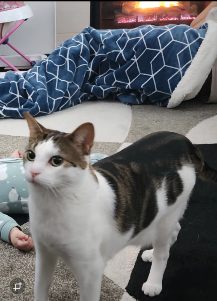 Harley is a curious one, especially when it comes to exploring garages or back decks. She has a marking like a triangle that goes from one side of her eye to the other.