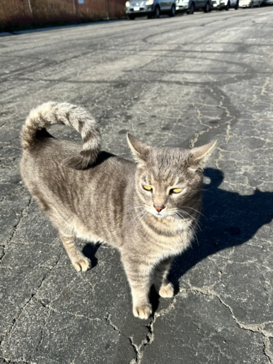 He is a gray tabby cat with a limp on his right leg and his tail makes a C and it touches his body. He has a raccoon type tail